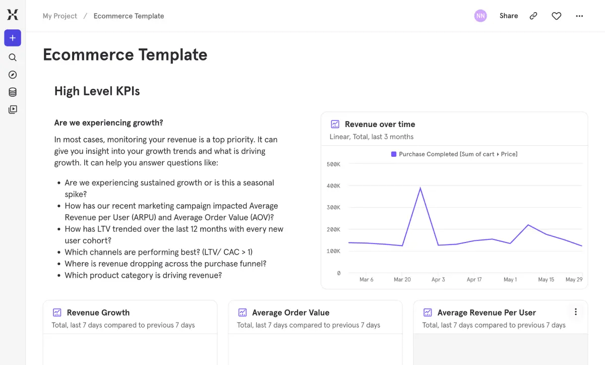 Revenue is growing, but do you know why — and where the next opportunity is? This template helps e-commerce teams go beyond top-line revenue to understand what customers are buying, where they drop off before purchasing, and which acquisition channels bring the most valuable buyers.